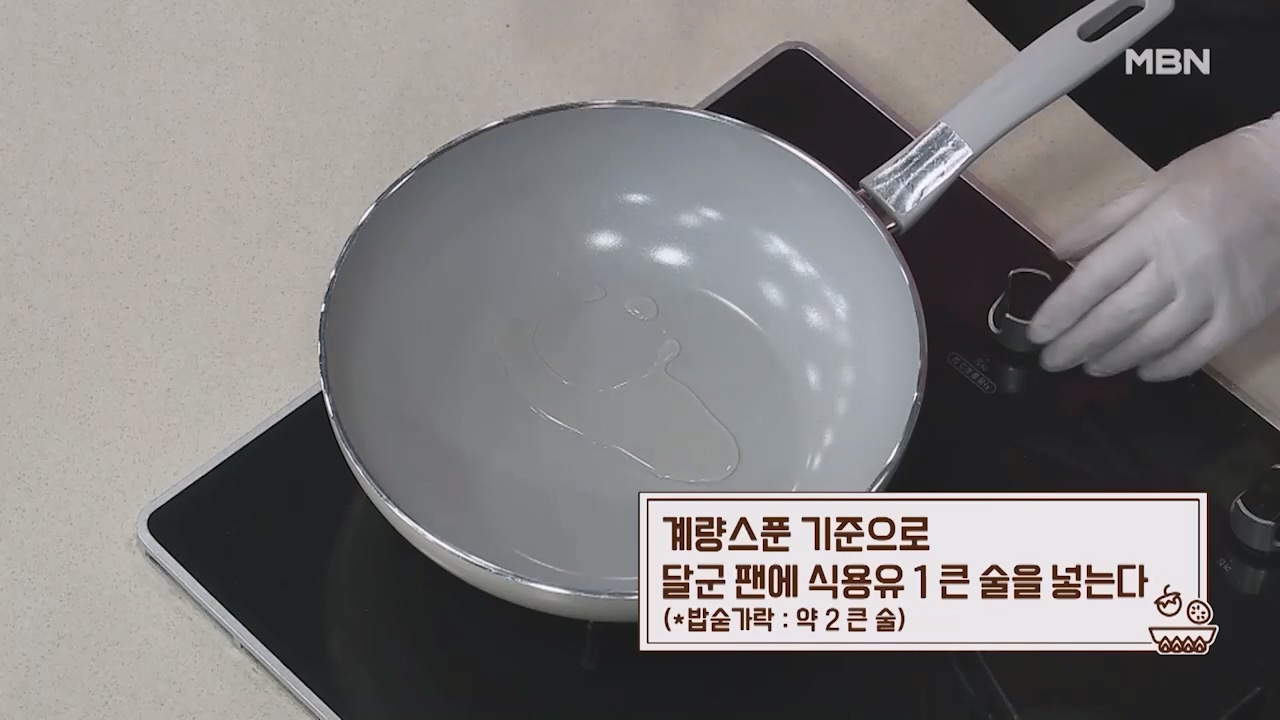 5. 계량스푼 기준으로 달군 팬에 식용유 1큰술을 넣습니다. (밥숟가락 약 2큰술)