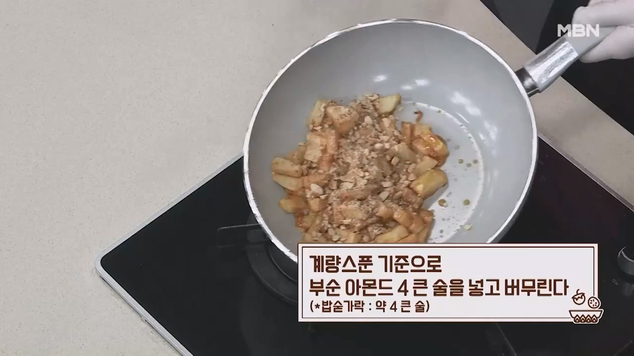 8. 계량스푼 기준으로 부순 아몬드 4큰술을 넣고 버무리면 맛있는 감자맛탕이 완성됩니다. (밥숟가락 약 4큰술)