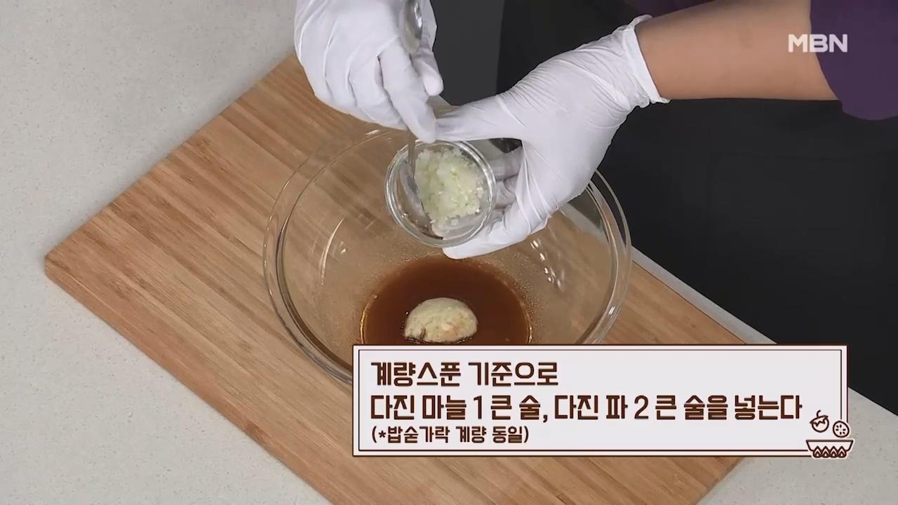 7. 계량스푼 기준으로 다진마늘 1큰술, 다진 파 2큰술을 넣습니다. (밥숟가락 계량 동일)