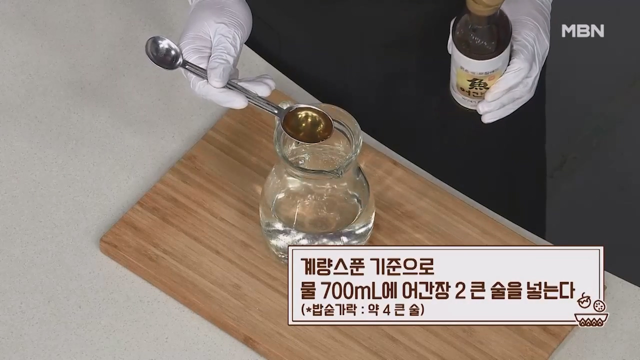 25. 계량스푼 기준으로 물 700mL에 어간장 2큰술을 넣습니다. (밥숟가락 약 4큰술)