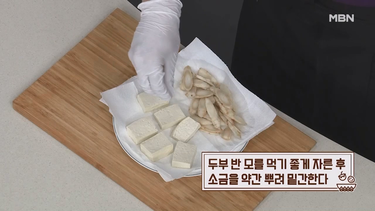 21. 두부 반모를 먹기 좋게 자른 후 소금을 약간 뿌려 밑간합니다.