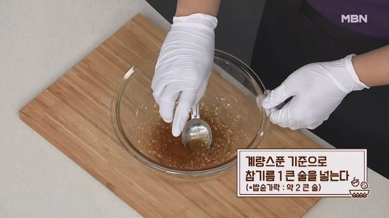 8. 계량스푼 기준으로 참기름 1큰술을 넣습니다. (밥숟가락 약 2큰술)