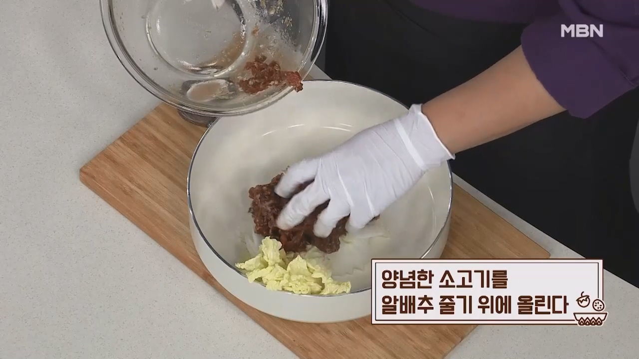13. 양념한 소고기를 알배추 줄기 위에 올립니다.