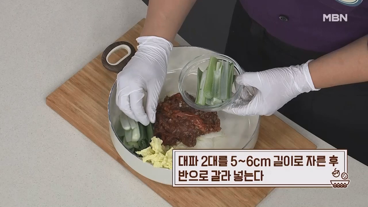 14. 대파 2대를 5~6cm 길이로 자른 후 반으로 갈라 넣습니다.