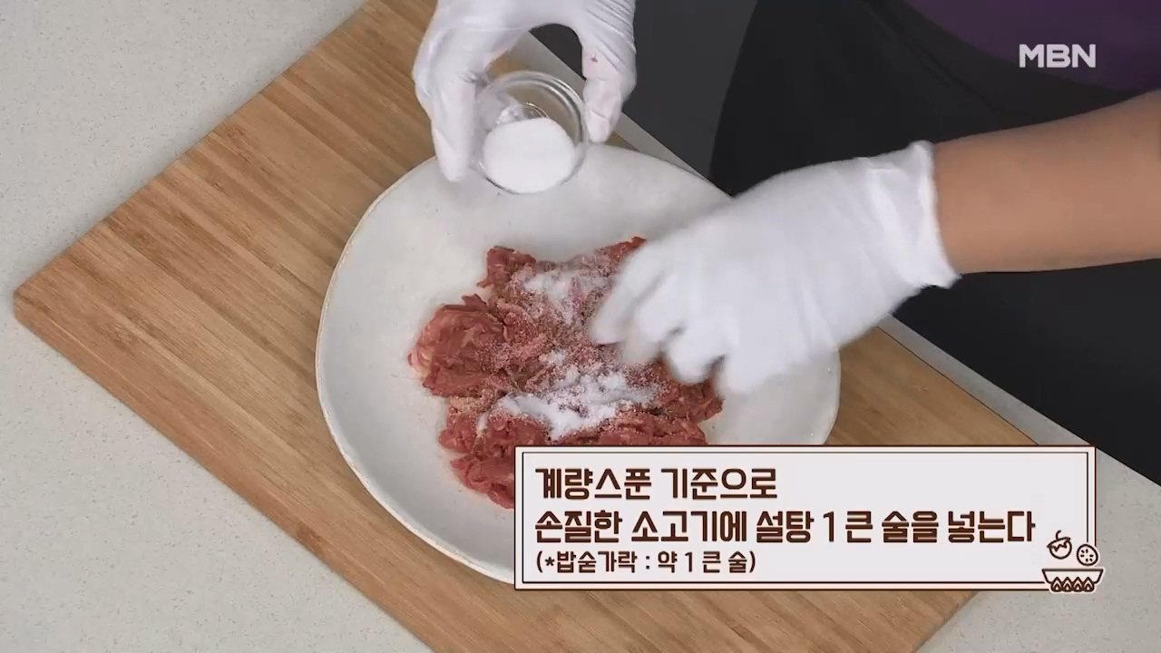 2. 계량스푼 기준으로 손질한 소고기에 설탕 1큰술을 넣습니다. (밥숟가락 약 1큰술)