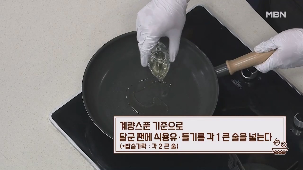 22. 계량스푼 기준으로 달군 팬에 식용유 1큰술, 들기름 1큰술을 넣습니다. (밥숟가락 각 2큰술)