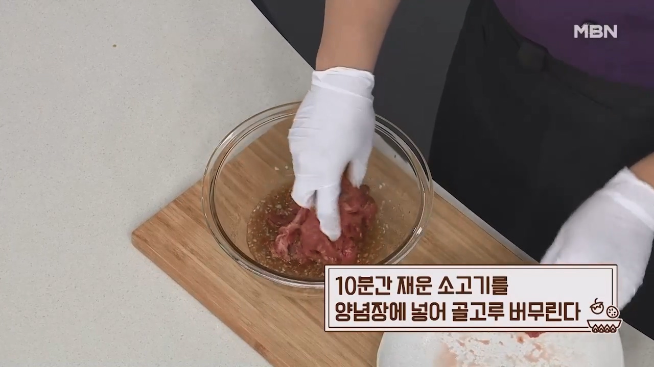 10. 10분간 재운 소고기를 양념장에 넣어 골고루 버무립니다.