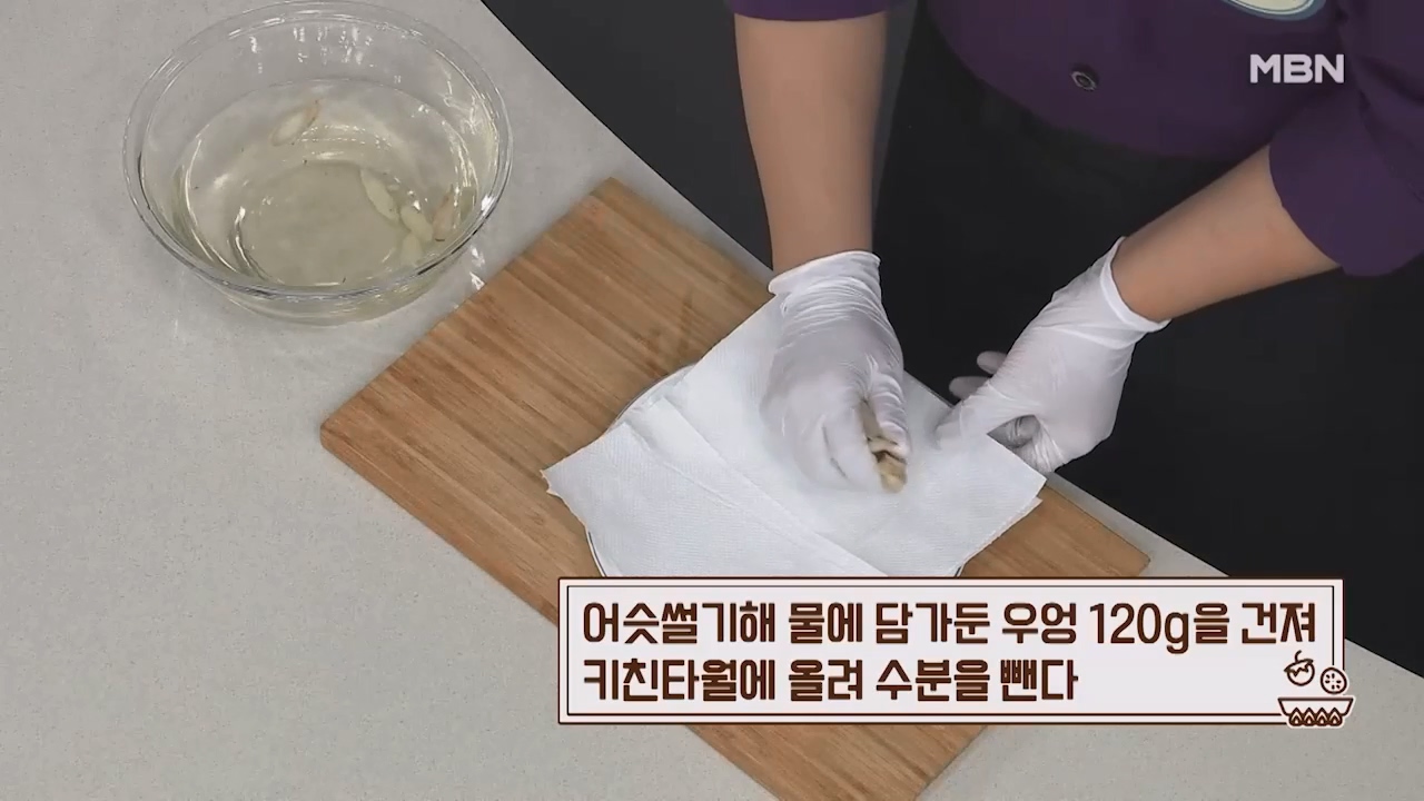 20. 어슷썰기해 물에 담가둔 우엉 120g을 건져 키친타월에 올려 수분을 제거합니다.