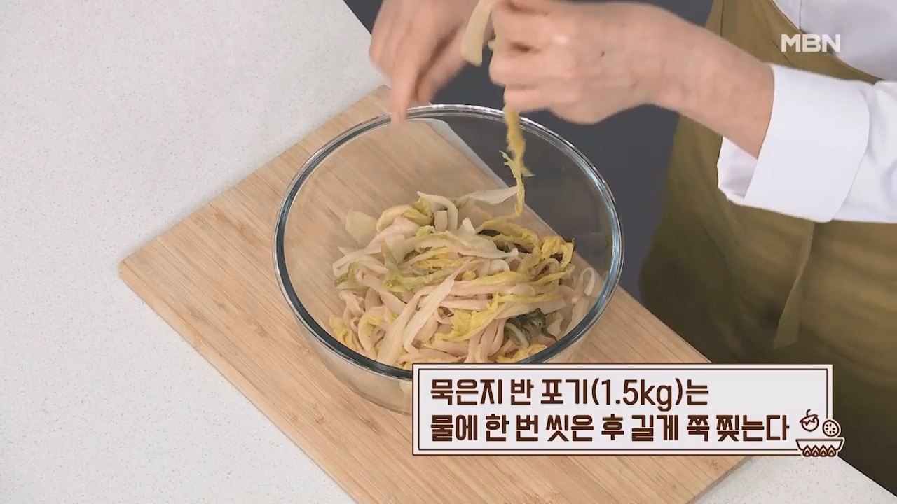 1. 묵은지 반 포기 (1.5kg)는 물에 한번 씻은 후 길게 쭉 찢어줍니다.