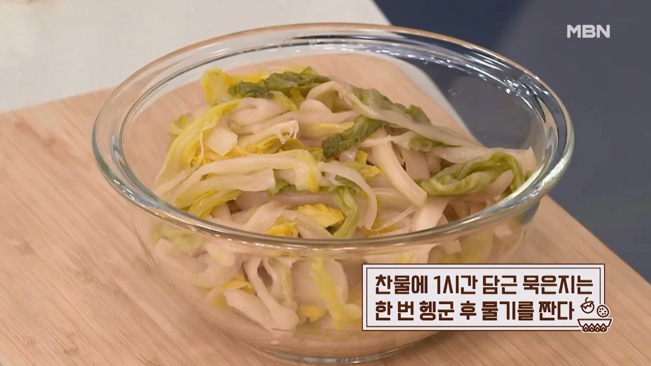 3. 찬물에 1시간 담근 묵은지는 한 번 헹군 후 물기를 짭니다.