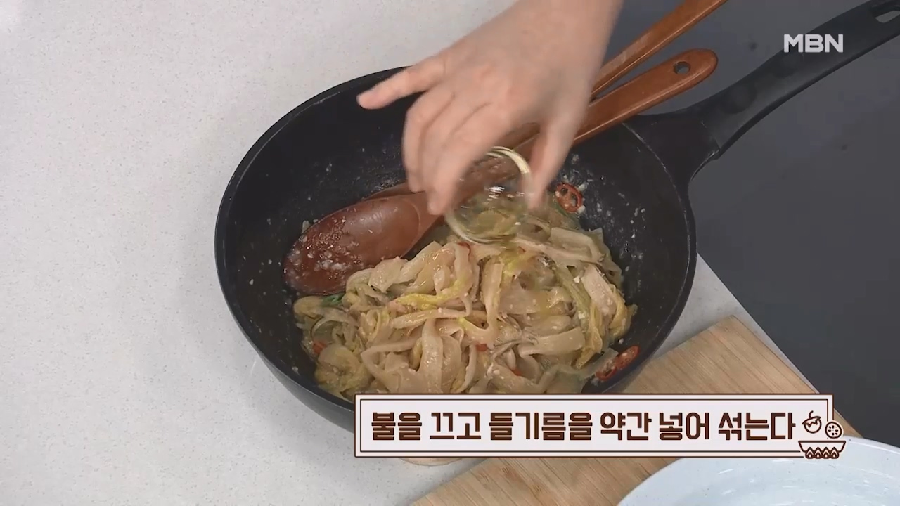 11. 불을 끄고 들기름을 약간 넣어 섞어줍니다.