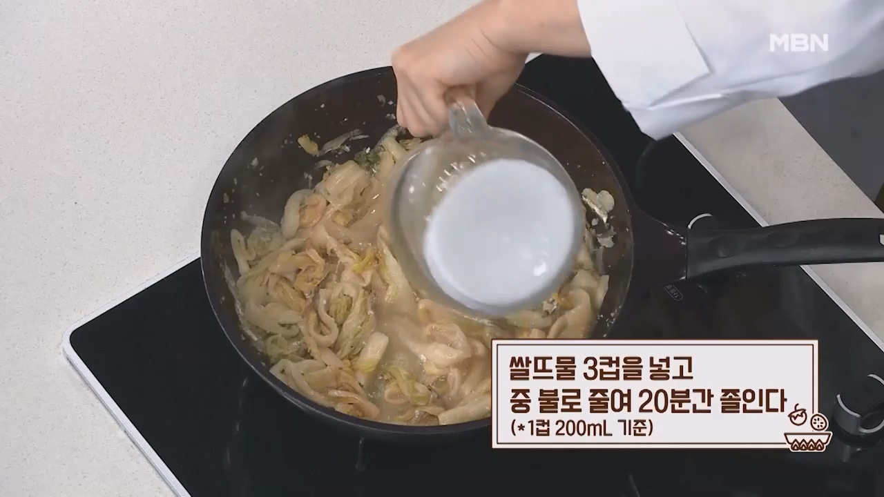 9. 쌀뜨물 3컵을 넣고 중불로 줄여 20분간 졸입니다. (1컵 200mL 기준)