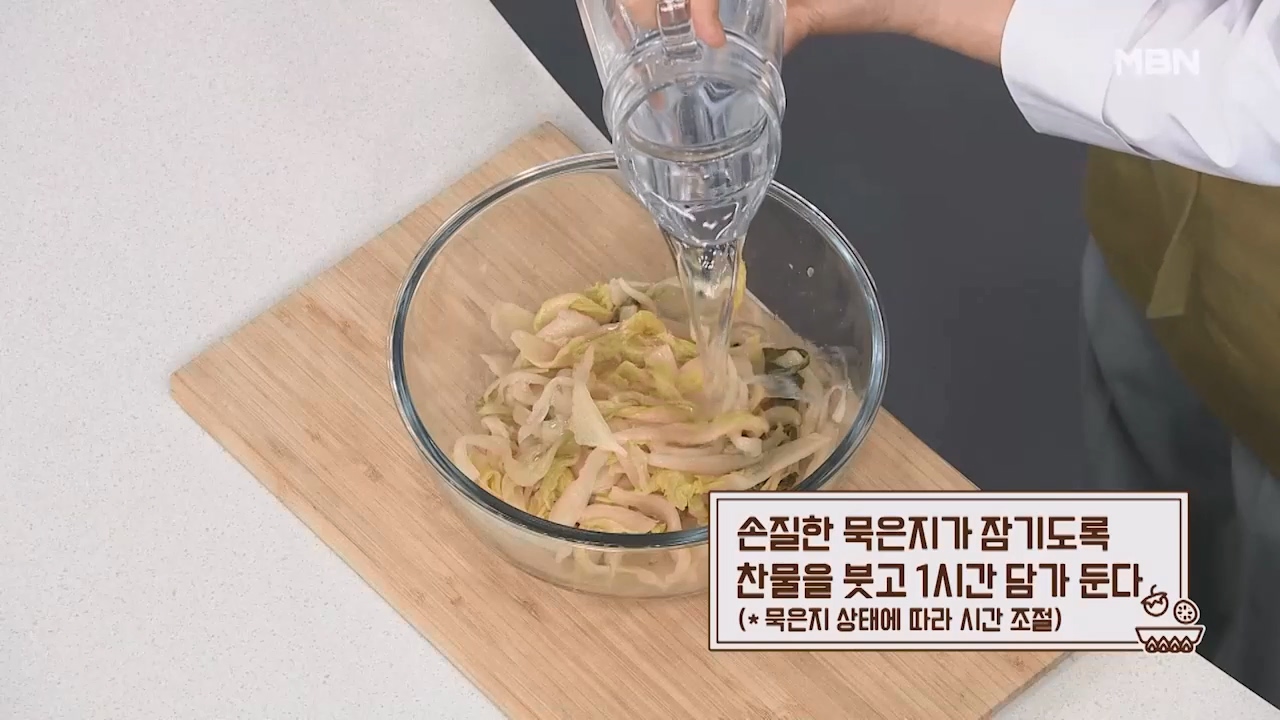 2. 손질한 묵은지가 잠기도록 찬물을 붓고 1시간 담가둡니다. (묵은지 상태에 따라 시간 조절을 합니다.)