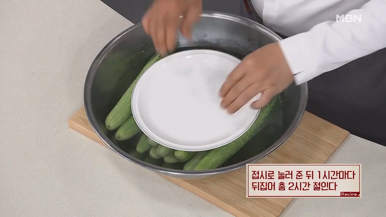 2. 접시로 오이를 눌러준 뒤 1시간마다 뒤집어 총 2시간 동안 오이를 절입니다.