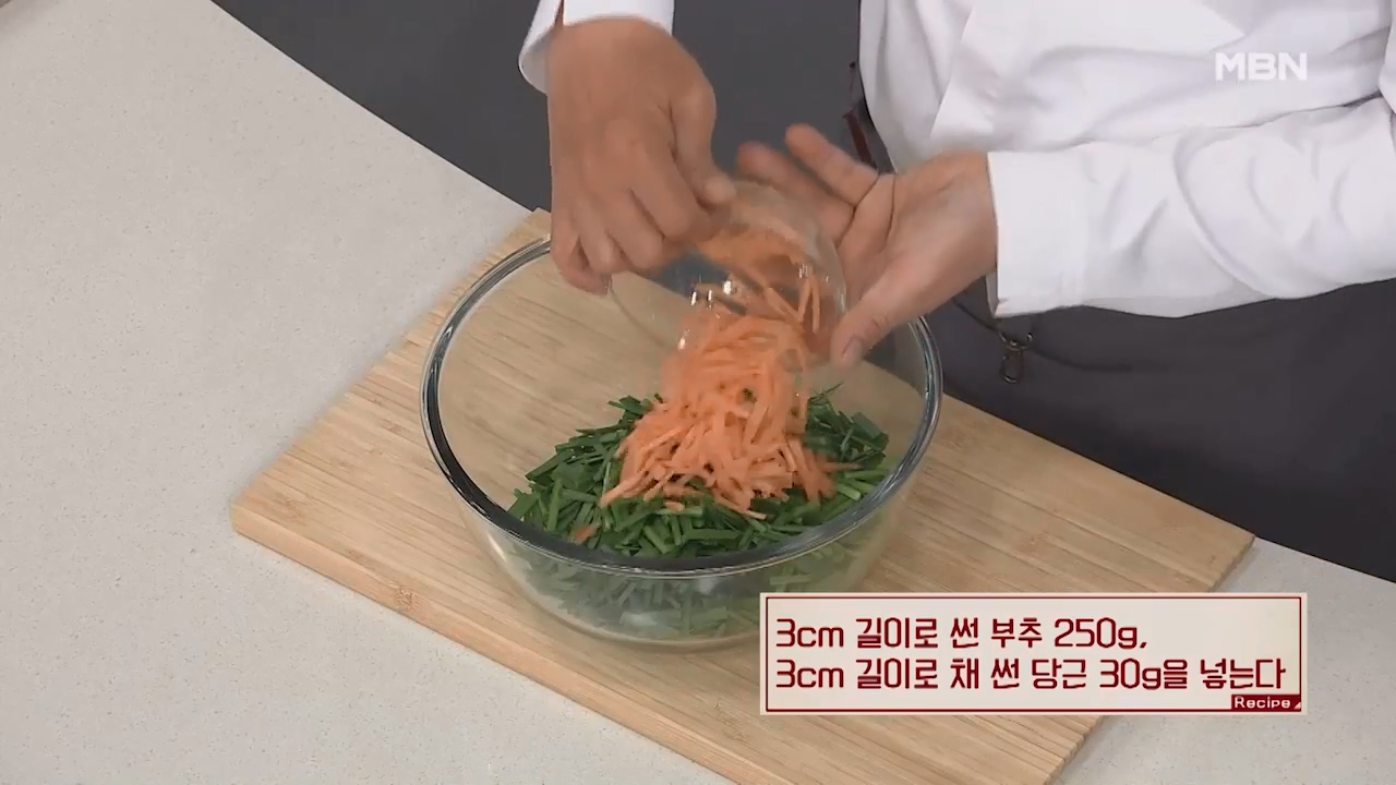 5. 볼에 3cm 길이로 썬 부추 250g, 3cm 길이로 채 썬 당근 30g을 넣습니다.