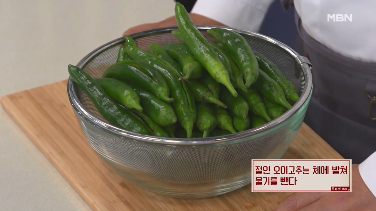 5. 절인 오이고추는 체에 밭쳐 물기를 제거합니다.