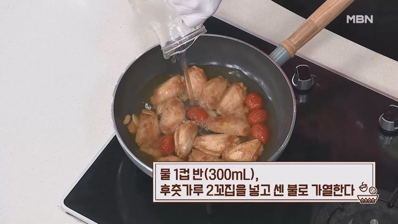 6. 물 1컵 반(300mL), 후춧가루 2꼬집을 넣고 센불로 가열하비낟.