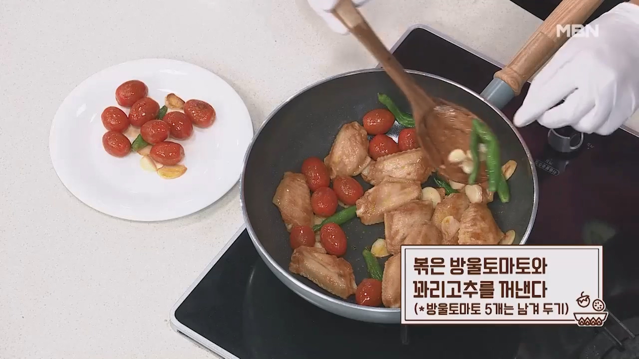 4. 방울토마토 17개, 꽈리고추 10개를 넣고 5분간 볶아줍니다.