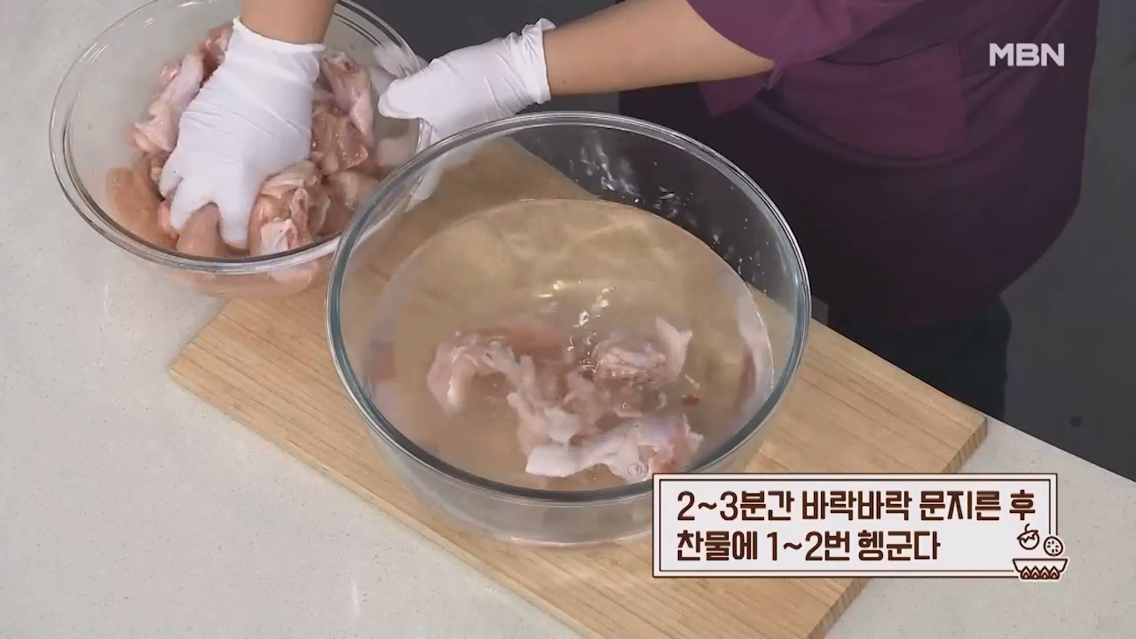 2. 2~3분간 닭볶음탕용 닭을 바락바락 문지른 후 찬물에 1~2번 헹궈줍니다.