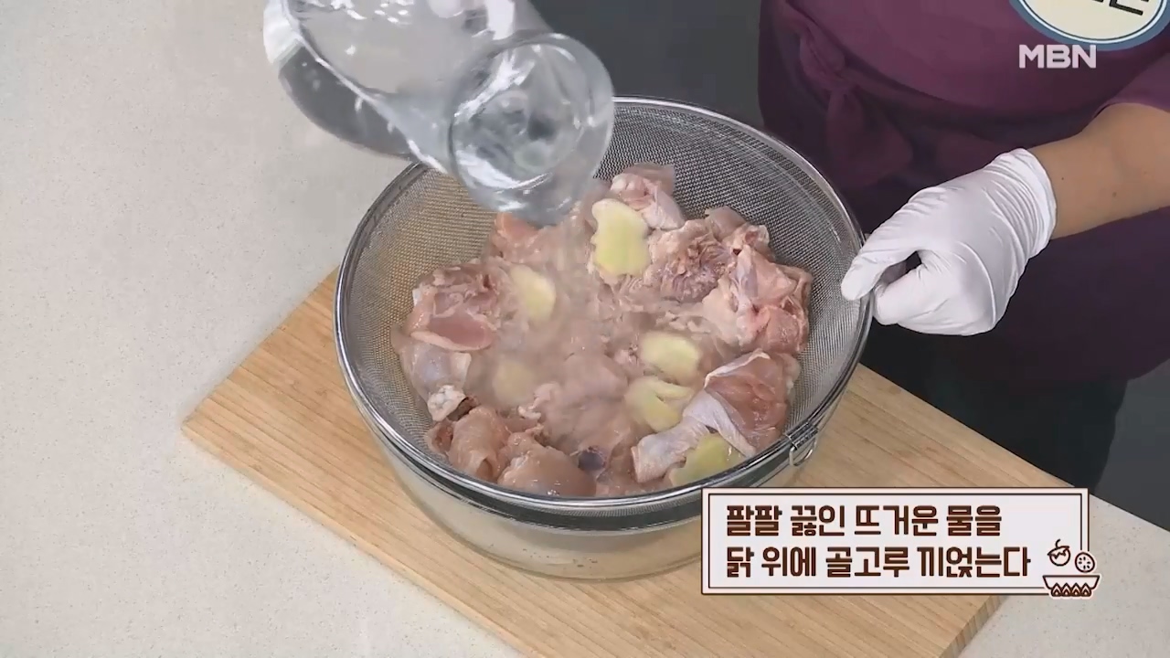 4. 팔팔 끓인 뜨거운물을 닭 위에 골고루 끼얹습니다.