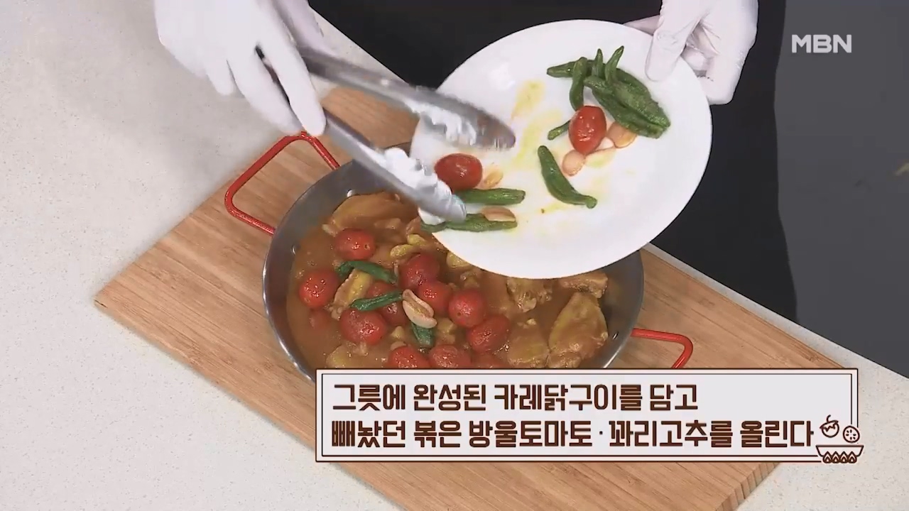 9. 그릇에 완성된 카레닭구이를 담고 빼놨던 볶은 방울토마토와 꽈리고추를 올리면 카레닭구이가 완성됩니다.