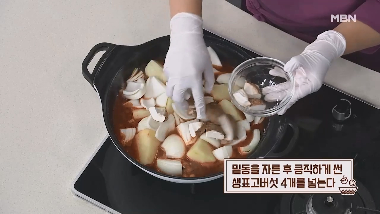 9. 밑동을 자른 후 큼직하게 썬 생표고버섯 4개를 넣습니다.