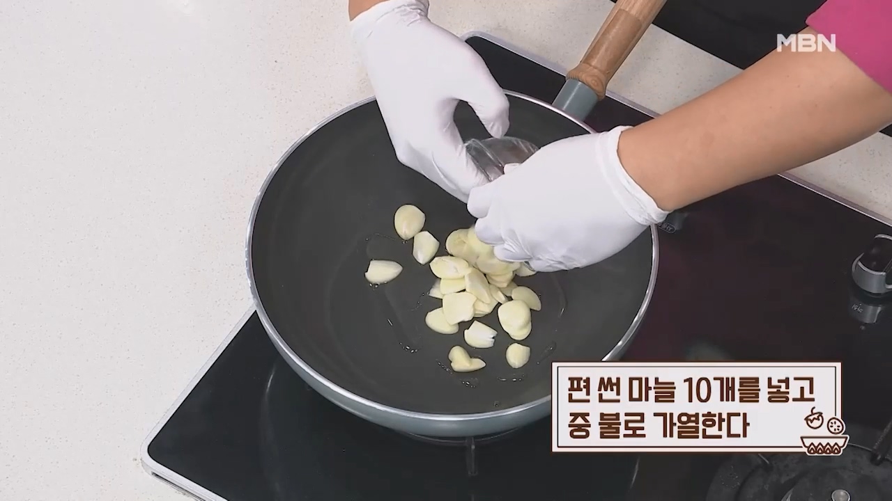 2. 편 썬 마늘 10개를 넣고 중 불로 가열합니다.