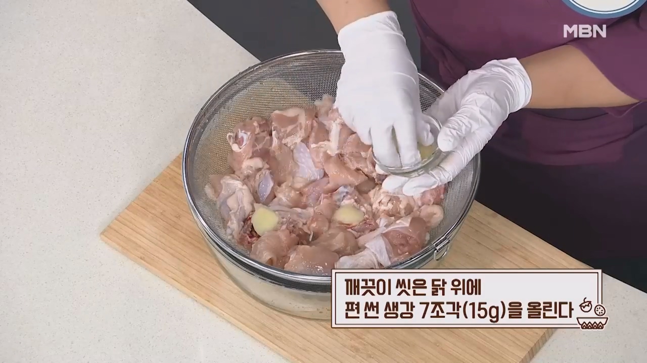 3. 채에 깨끗이 씻은 닭을 넣고 위에 편 썬 생강 7조각 (15g)을 올립니다.