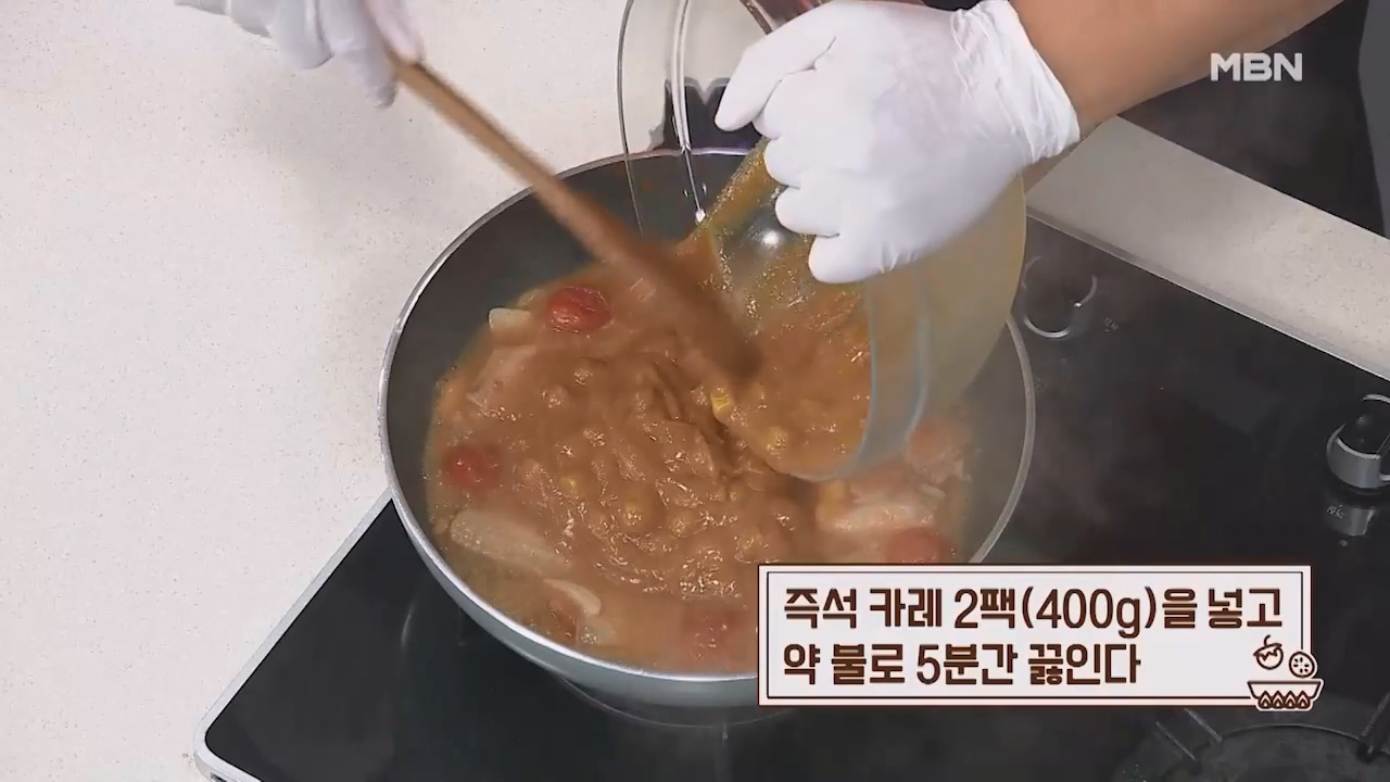 8. 즉석카레 2팩(400g)을 넣고 약불로 5분간 끓입니다.