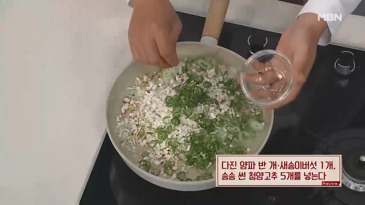 3. 다진 양파 반개, 새송이버섯 1개, 송송 썬 청양고추 5개를 넣습니다.