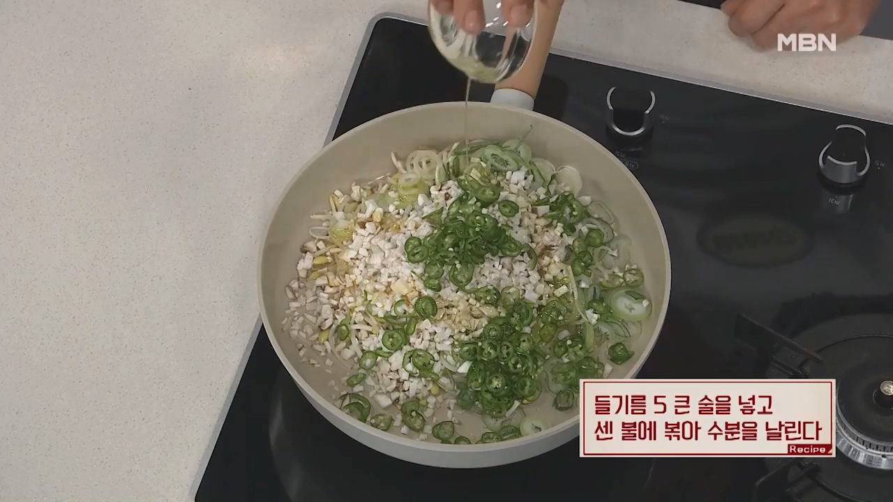4. 들기름 5큰술을 넣고 센불에 볶아 수분을 날립니다.
