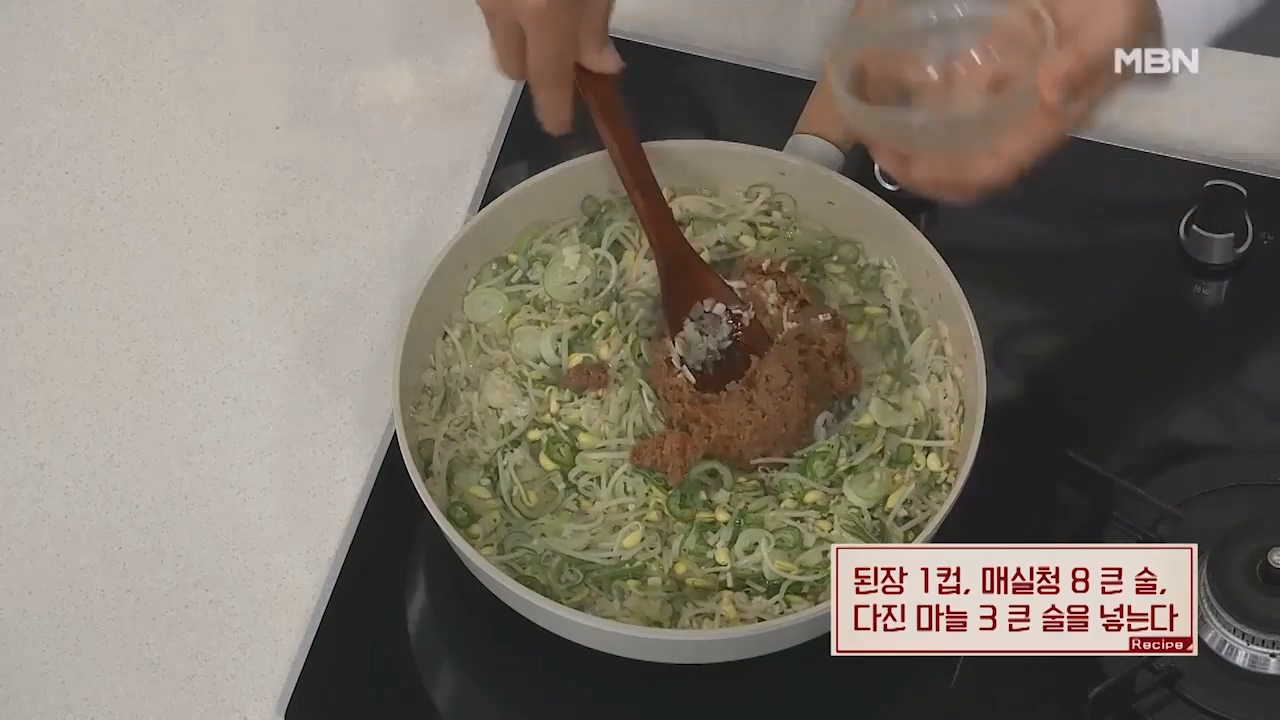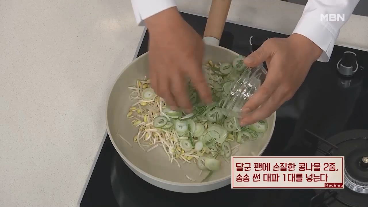 2. 달군 팬에 손질한 콩나물 2줌, 송송 썬 대파 1대를 넣어줍니다.