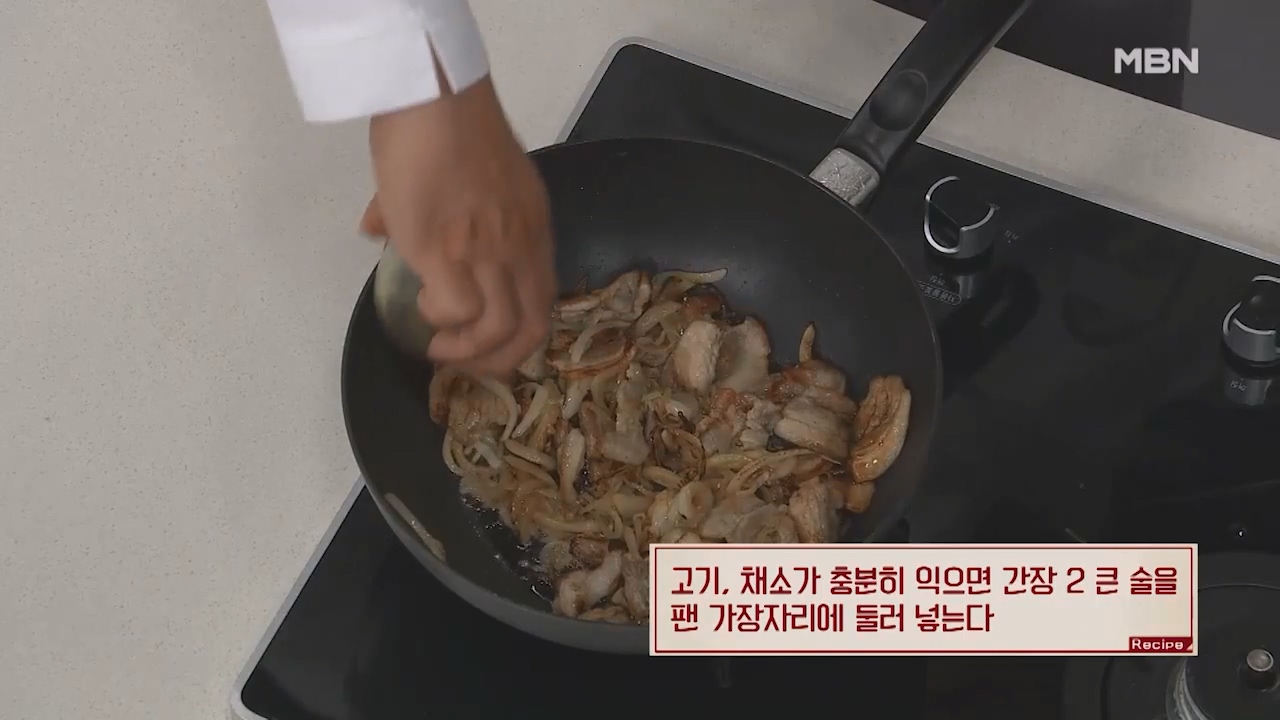 4. 고기와 채소가 충분히 익으면 간장 2큰술을 팬 가장자리에 둘러 넣습니다.