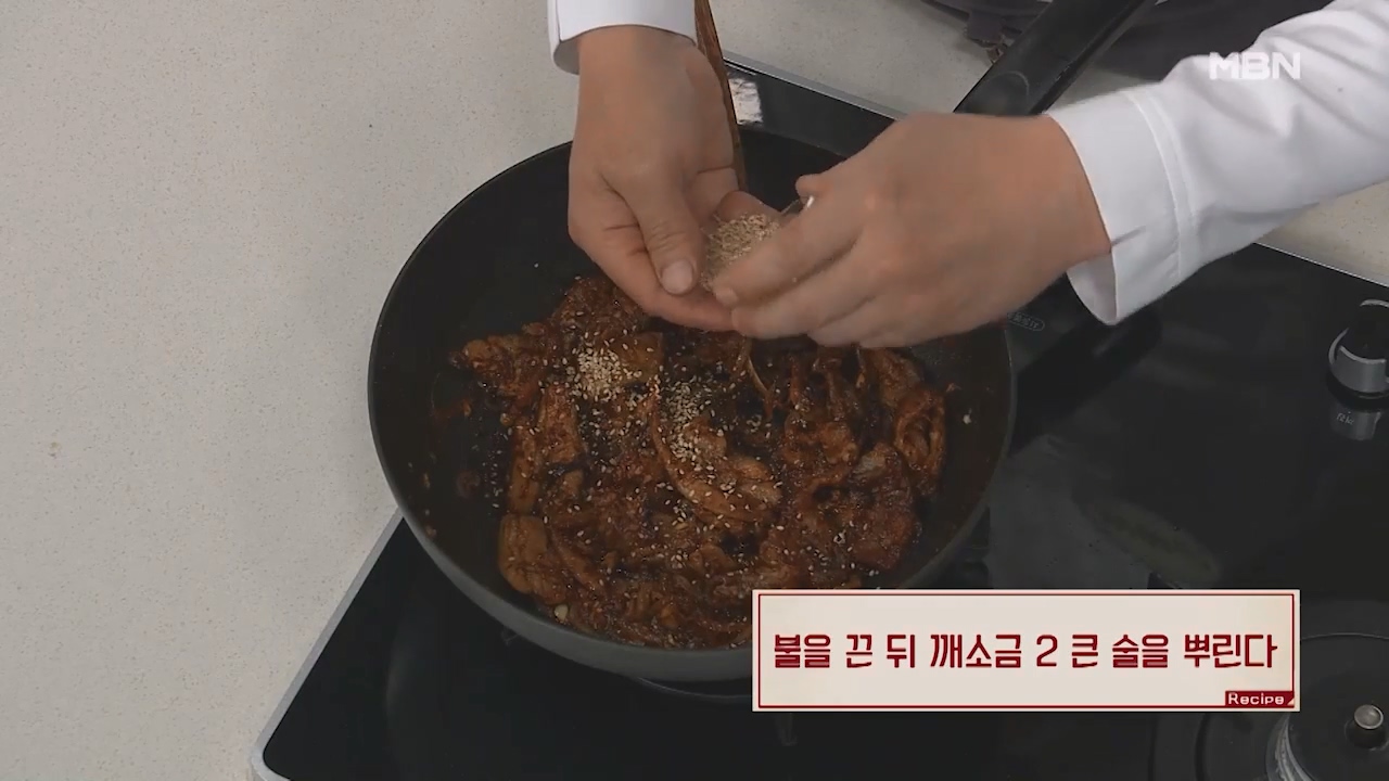 7. 불을 끈 뒤 깨소금 2큰술을 뿌리면 맛있는 제육볶음이 완성됩니다.