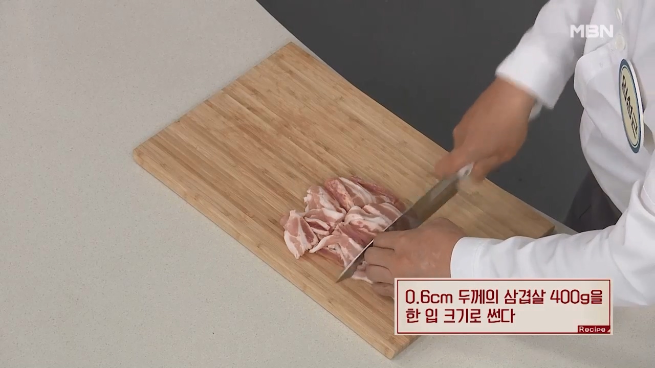 1. 0.6cm 두께의 삼겹살 400g을 한입 크기로 썰어줍니다.