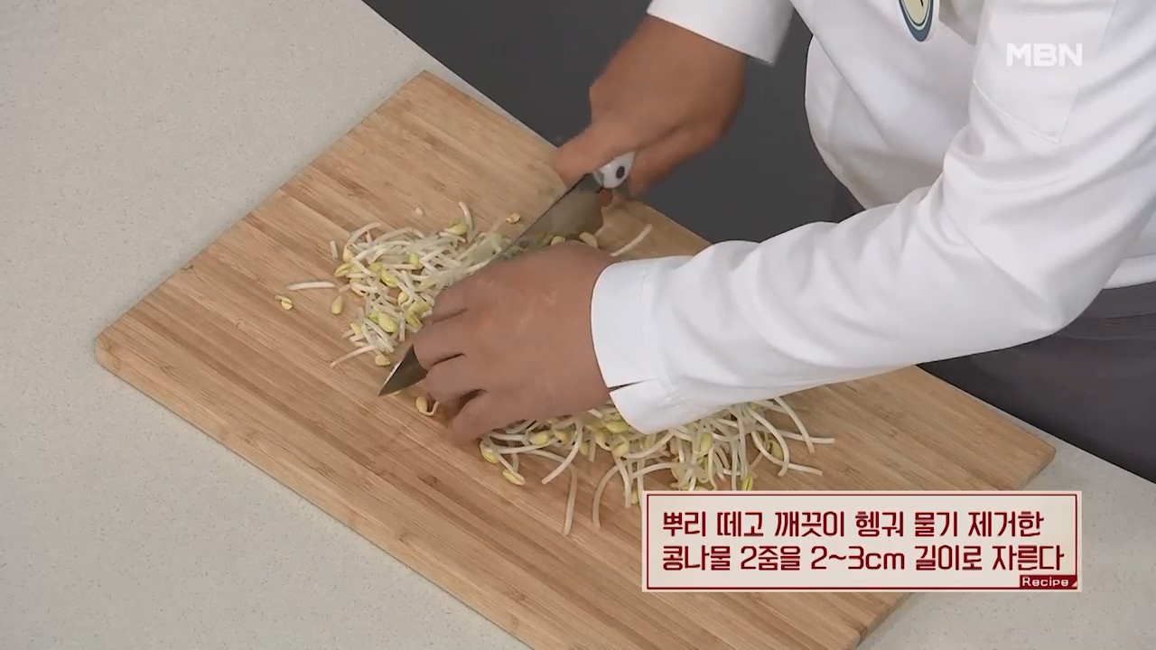 1. 콩나물 2줌의 뿌리를 떼고 깨끗이 헹궈 물기를 제거하고 2~3cm 길이로 잘라줍니다.