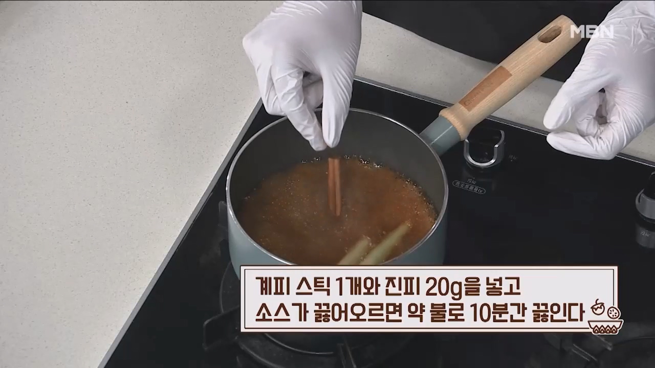 16. 계피 스틱 1개와 진피 20g을 넣고 소스가 끓어오르면 약불로 10분간 끓입니다.