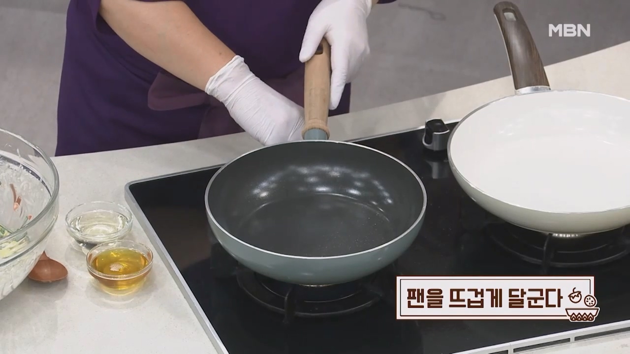 17. 팬에 식용유 2큰술과 들기름 2큰술을 두릅니다. (1큰술은 계량스푼 15mL 기준)