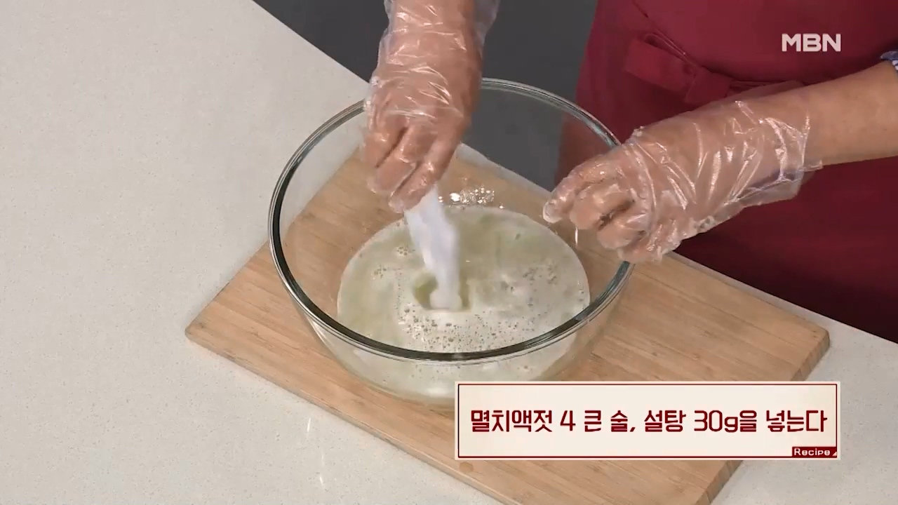 7. 멸치액젓 4큰술, 설탕 30g을 넣습니다.
