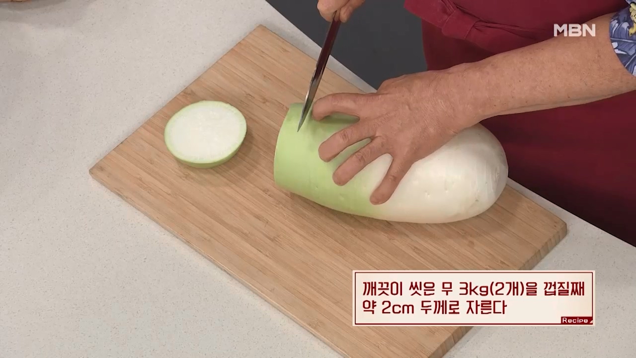 1. 깨끗이 씻은 무 3kg(2개)을 껍질째 약 2cm 두께로 자릅니다.
