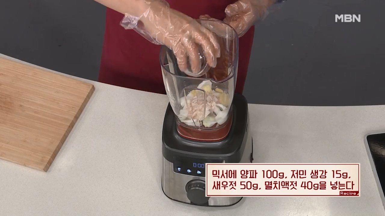 6. 믹서에 양파 100g, 저민 생강 15g, 새우젓 50g, 멸치액젓 40g을 넣습니다.