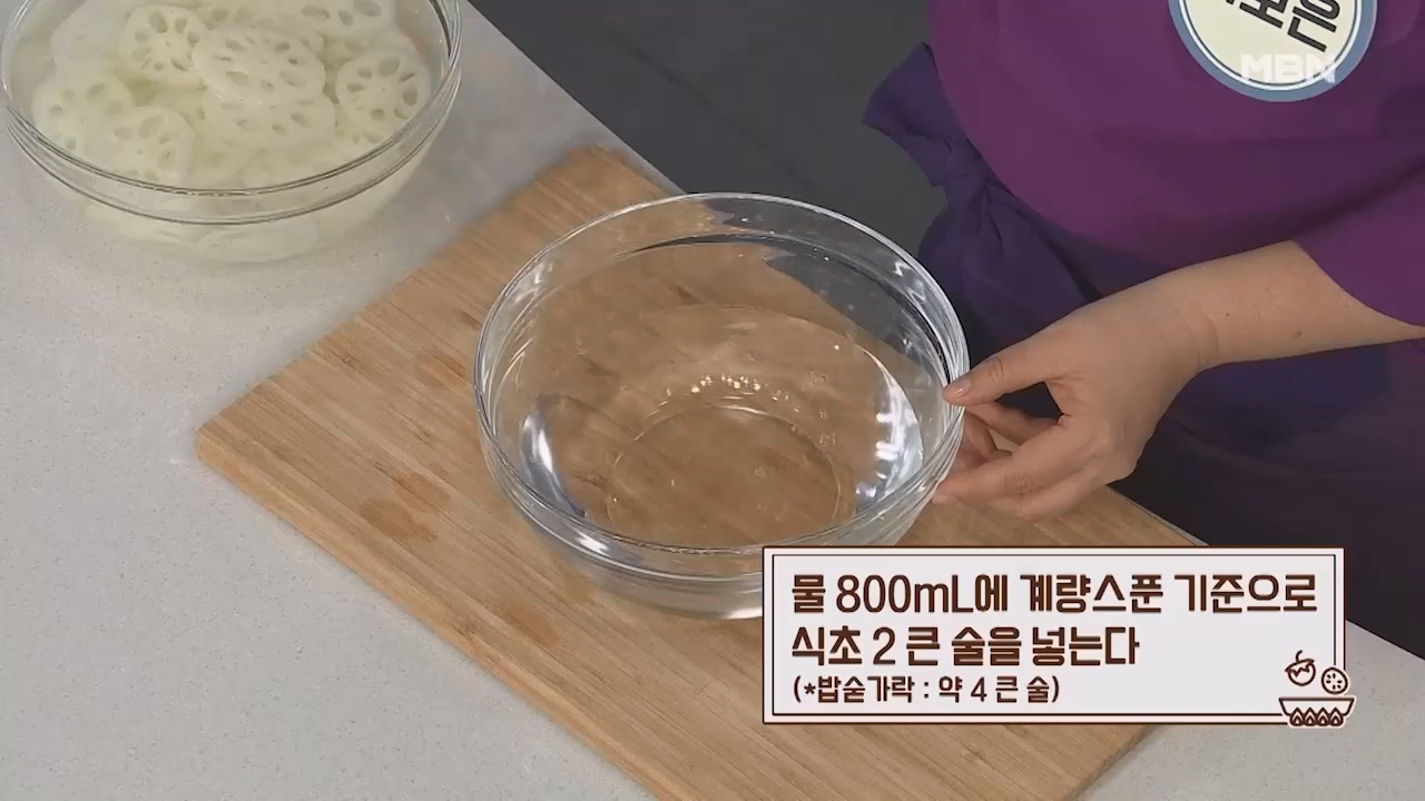 2. 껍질 벗긴 연근을 3~4mm 두께로 자른 후 바로 찬물에 담급니다.