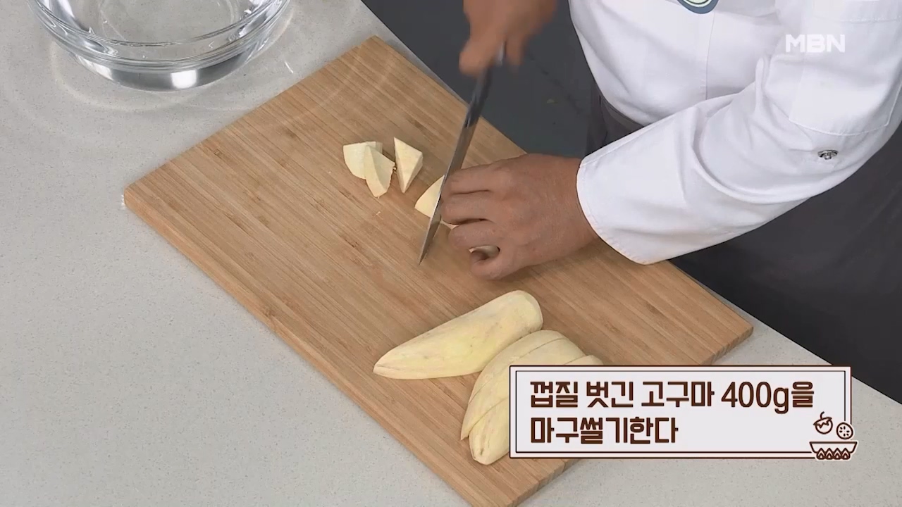 1. 껍질 벗긴 고구마 400g을 마구썰어줍니다.