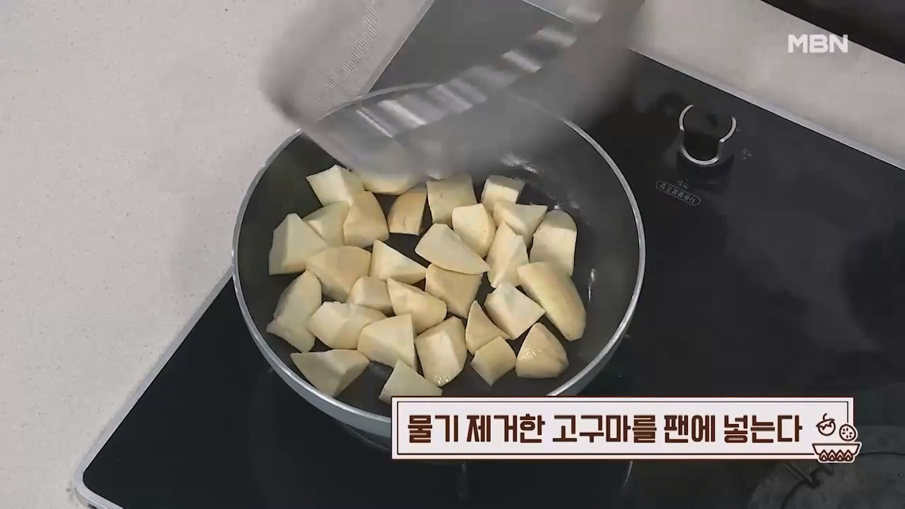 3. 물기를 제거한 고구마를 팬에 넣습니다.