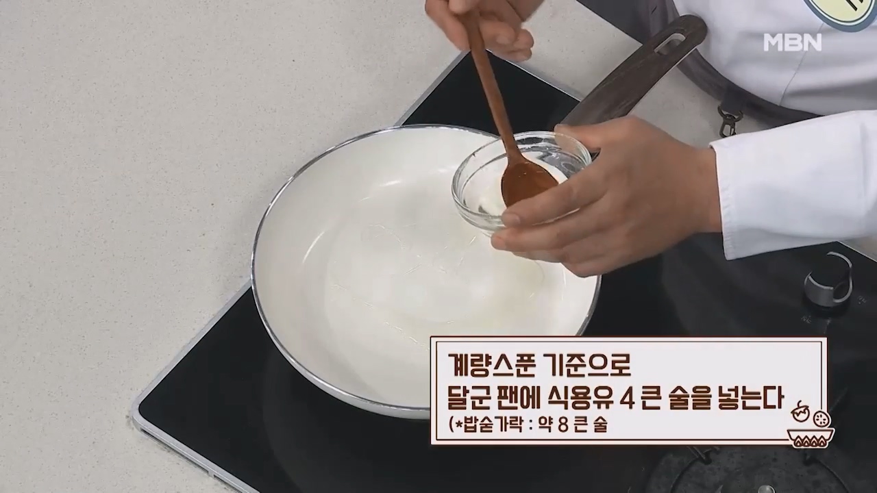 8. 계량스푼 기준으로 달군 팬에 식용유 4큰술을 넣습니다. (밥숟가락 약 8큰술)