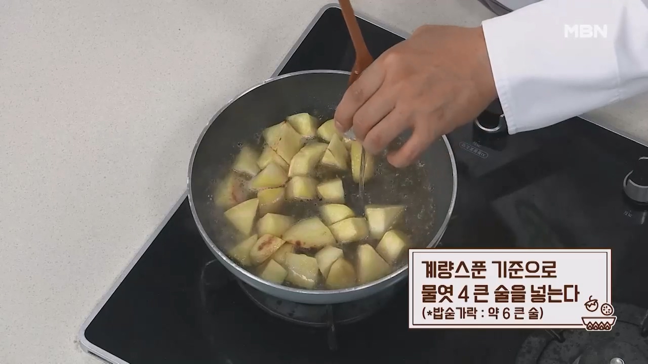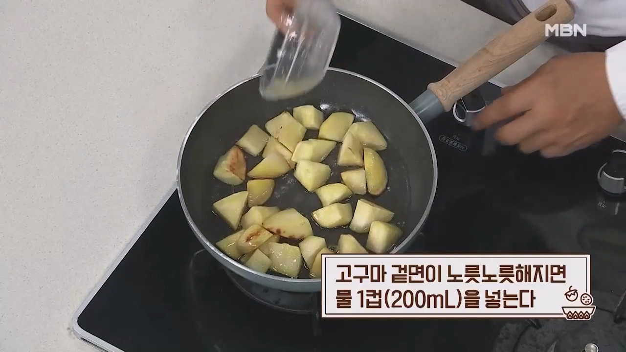 5. 고구마 겉면이 노릇노릇해지면 물 1컵(200mL)을 넣어줍니다.