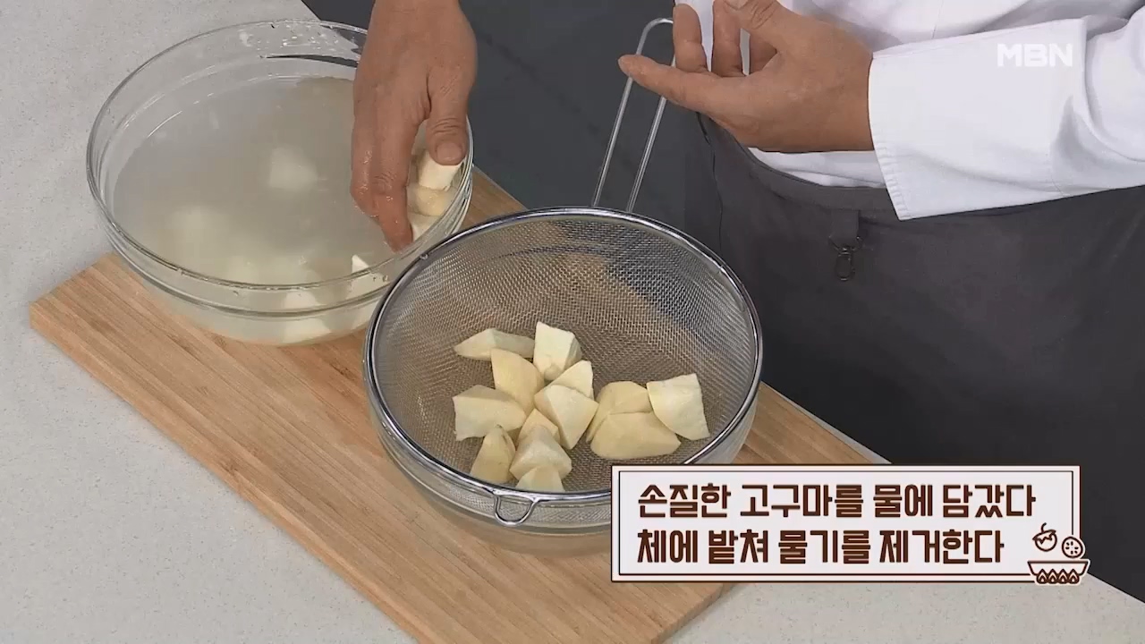 2. 손질한 고구마를 물에 담갔다 체에 밭쳐 물기를 제거합니다.