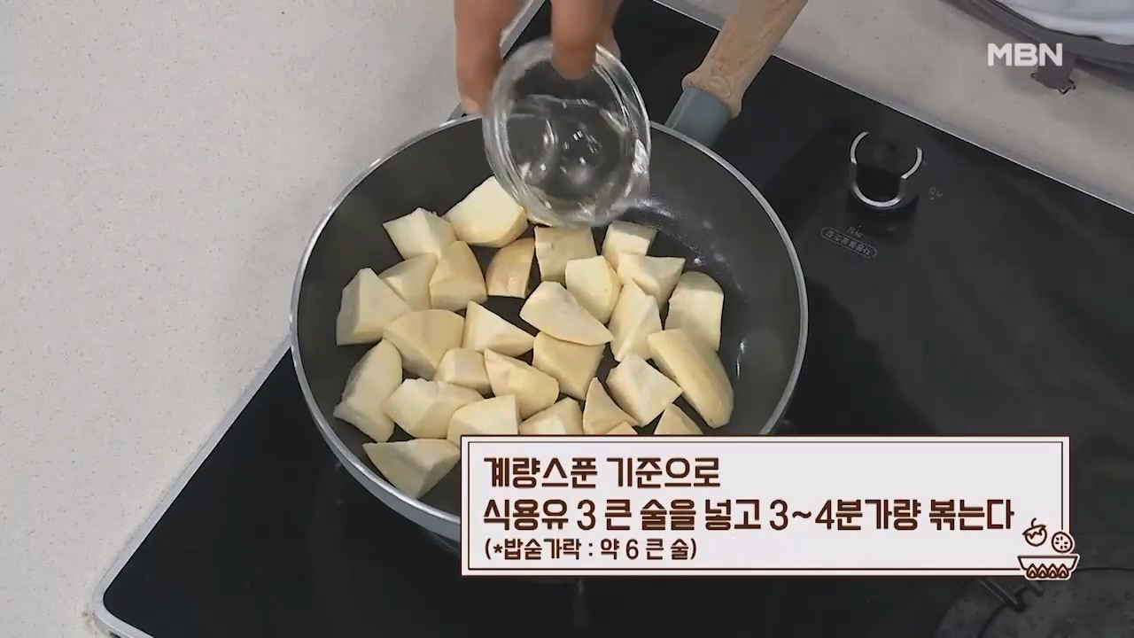 4. 계량스푼 기준으로 식용유 3큰술을 넣고 3~4분 가량 볶아줍니다. (밥숟가락 약 6큰술)