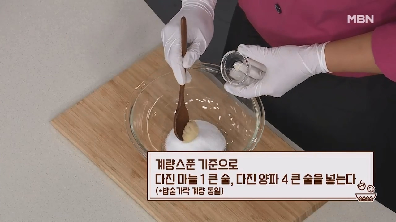7. 계량스푼 기준으로 다진마늘 1큰술, 다진 양파 4큰술을 넣습니다.