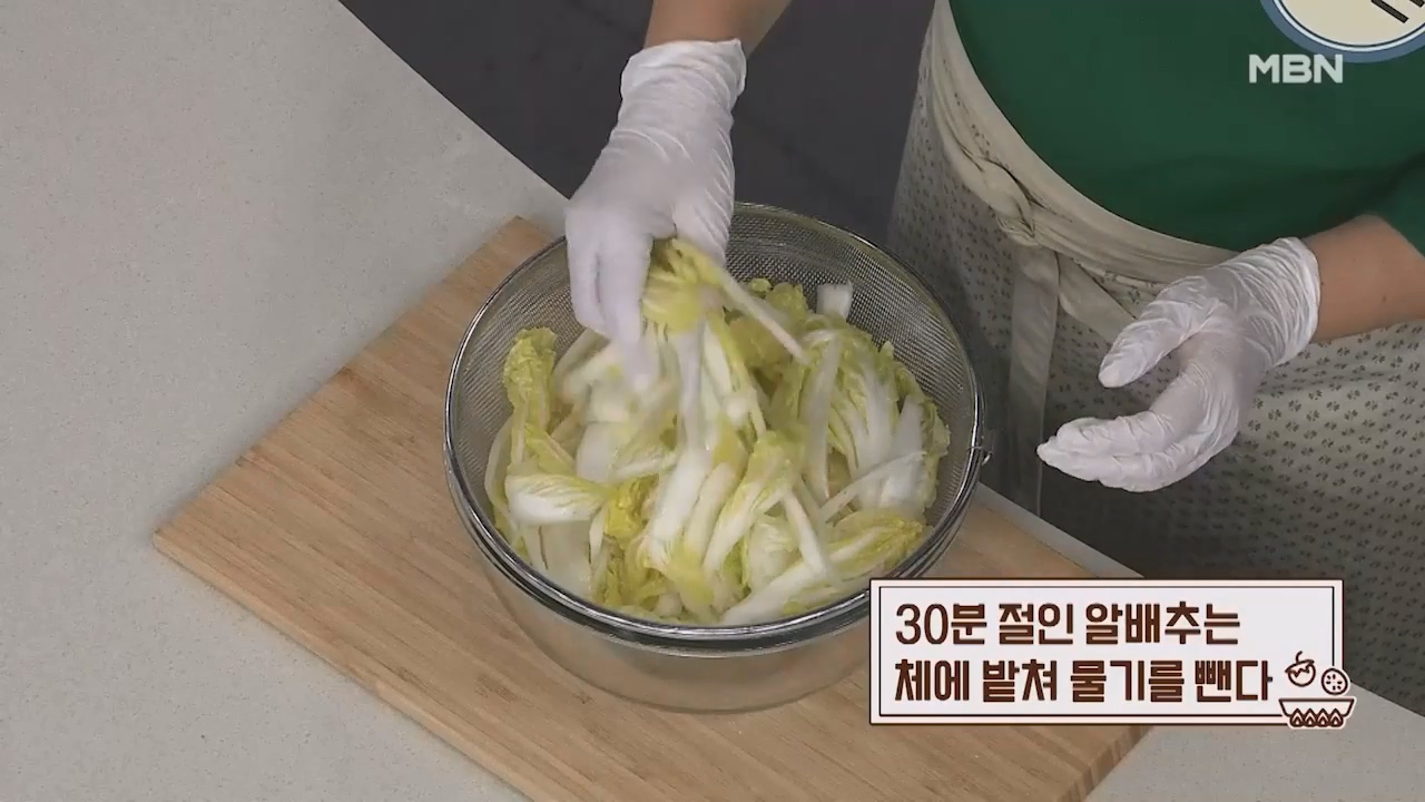 5. 30분 절인 알배추는 체에 밭쳐 물기를 제거합니다.